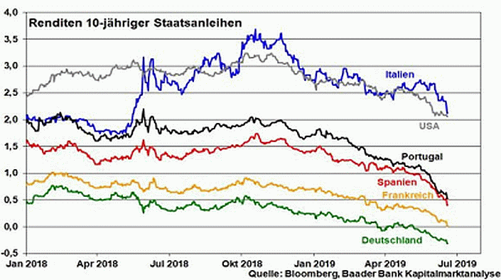 EZB-Chef Draghi hat am zurückliegenden Dienstag auf einem Notenbankforum in portugiesischen Sintra gesagt, er erwarte für die kommenden Quartale eine anhaltende Wirtschaftsschwäche. Sollte sich der Wirtschaftsausblick dann nicht aufhellen, sei eine zusätzliche Lockerung der Geldpolitik nötig.Ein noch tieferer Einlagenzinssatz für Banken (aktuell -0,4%) würde die ohnehin schwache Profitabilität der Euro-Banken zusätzlich belasten. Und so betonte Draghi besonders, dass es noch erheblichen Spielraum für Anleihenkäufe durch die Notenbank gibt (und dachte dabei wohl v.a. an diejenigen seines Heimatlandes Italien…). Was Wunder, dass auf die Wiederaufnahme des Anleihenaufprogramms gesetzt wird. Die Renditen von Staatsanleihen sind weltweit im Sinkflug, in einigen Ländern Europas liegen sie auf historischen Tiefs.