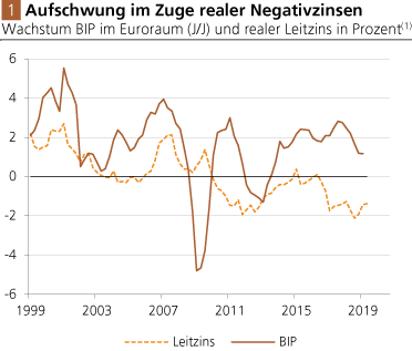 Aber nicht nur die ohnehin angespannte Lage der Euro-Banken macht eine Abkehr von der Null- und Negativzinspolitik in den kommenden Jahren höchst unwahrscheinlich. Auch die Euroraum-Konjunktur hängt mehr denn je von extrem niedrigen Zinsen ab. Wie Abb. 1 zeigt, hat sich der Aufschwung nach der Krise 2008/2009 im Zuge negativer Kurzfristzinsen ereignet.