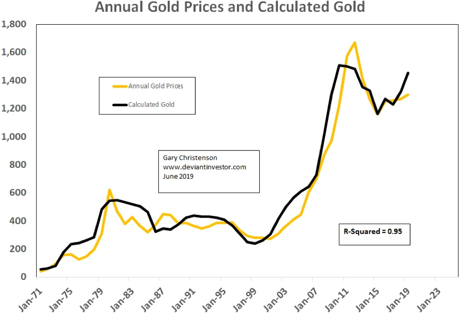 Das Modell zeigt einen geschätzten Wert eines (jährlichen, durchschnittlichen) Goldpreises basierend auf makroökonomischen Variablen. Es ist ein Bewertungsmodell.