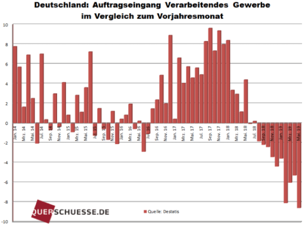 Unser Land steht vor einer wesentlich gewaltigeren Krise, die offenkundig niemand erkennt beziehungsweise wahrhaben möchte: Rezession. Die fetten Jahre des Exportweltmeisters Deutschland sind endgültig vorbei. Der saisonbereinigte und reale Auftragseingang der deutschen Industrie sank im Mai 2019 um 8,6 Prozent zum Vorjahresmonat! Es geht im Vergleich zum Vorjahresmonat den zehnten Monat in Folge abwärts! Erste Unternehmen kündigen Entlassungen an und viele werden folgen.