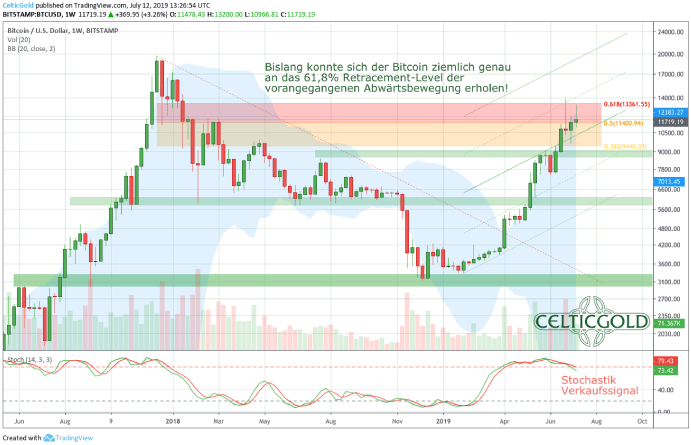 Mit der kürzlich erreichten Preisspitze bei 13.887 US-Dollar wurde etwas mehr als 61,8% der vorangegangenen Abwärtswelle wieder aufgeholt. Gleichzeitig wurde damit eine natürliche Widerstandszone erreicht, an der versierte Adressen mit Sicherheit Gewinne mitgenommen haben und ihre Long-Positionen zunächst verkleinert haben.