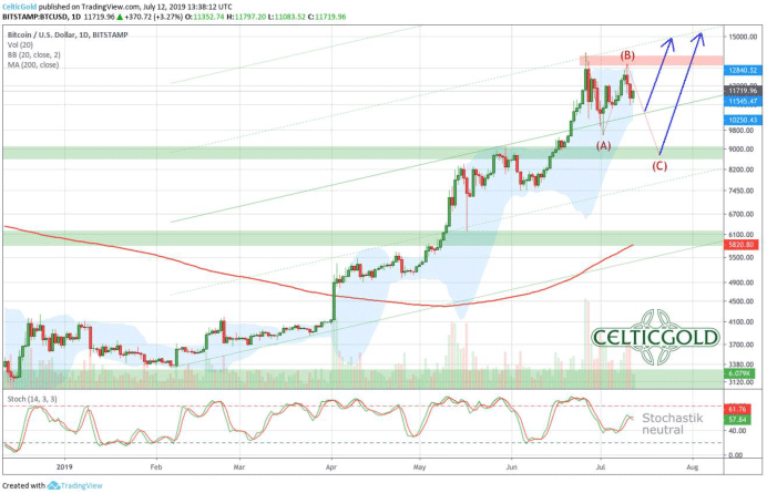 In diesem Fall wären jetzt die Punkte A und B definiert. Das finale Tief bei C könnte dann erst im Bereich der Unterstützungszone zwischen 8.800 und 9.200 US-Dollar zu finden sein. Alternativ fängt das untere Bollinger Band (10.250 US-Dollar) die Kurse aber bereits auf.