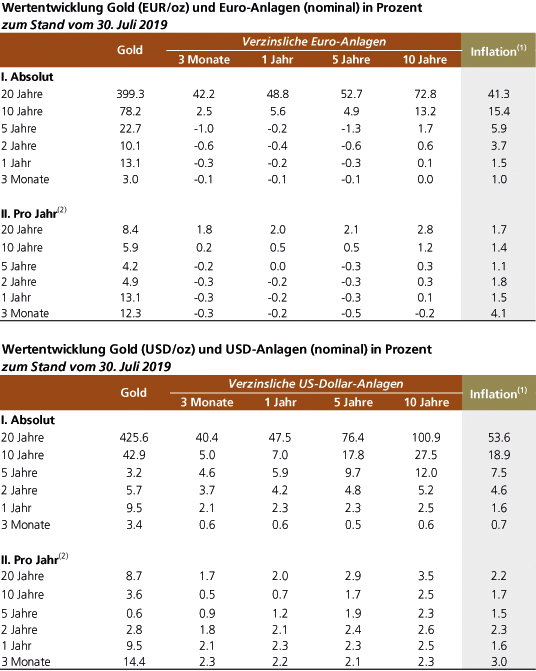Zu (1): Gold ist eine Währung, und damit steht es in direkter Konkurrenz zu den offiziellen Währungen wie zum Beispiel US-Dollar, Euro, Schweizer Franken etc. Daher macht es auch Sinn, die Wertentwicklung des Goldes mit der des US-Dollar und Euro zu vergleichen, wie es in den beiden nachstehenden Tabellen geschieht.