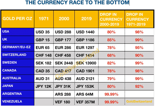 Die Botschaft könnte klarer nicht sein. Die meisten großen Währungen haben seit Nixons fataler Entscheidung von 1971 effektiv 98%-99% ihres Wertes verloren. Einige Währungen wie der Schweizer Franken, DM/ Euro und der Yen haben unwesentlich besser abgeschnitten.