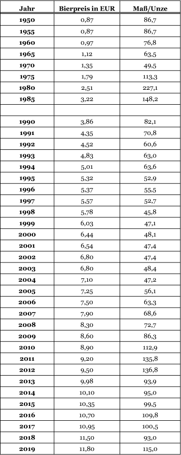 Anhang: Preisentwicklung für 1 Maß Bier