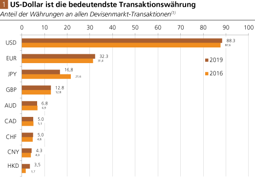 Quelle: Bank für Internationalen Zahlungsausgleich; Graphik Degussa. (1) Auf Net-Net-Basis, tägliche Umsätze im OTC-Markt im April 2019.