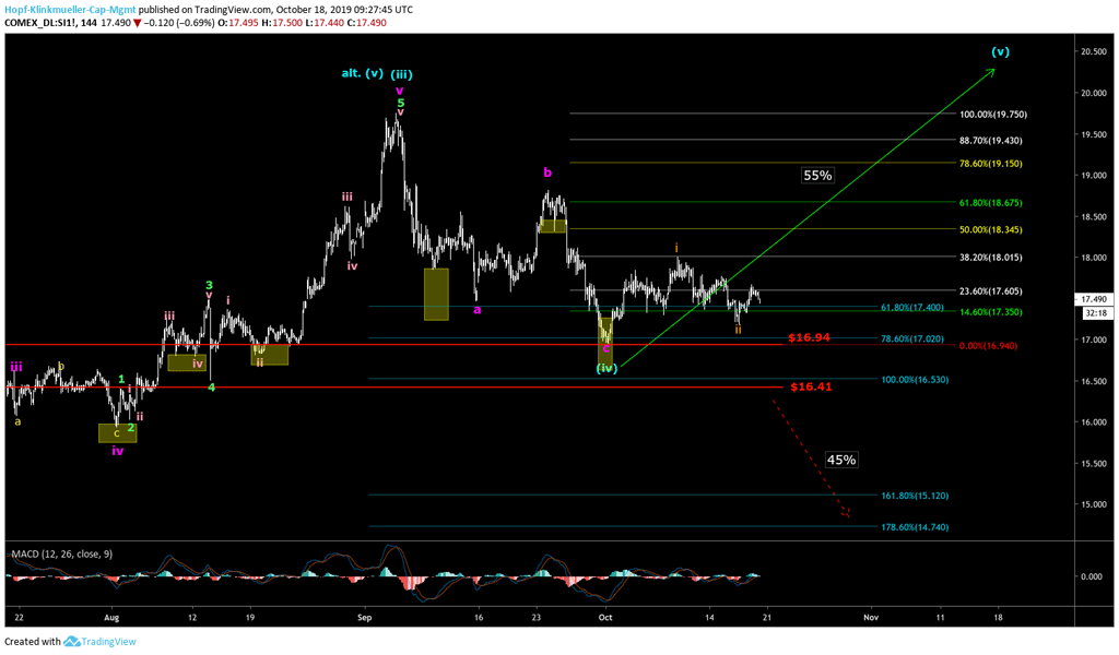Unsere Skepsis bleibt der richtige Indikator für die aktuelle Entwicklung bei Silber. Zwar konnte das weiße Metall seit dem Tief bei 17.18 $ gut anziehen, vernichtet aber im heutigen Handel wieder eine mögliche Impulsstruktur. Damit sind wir wieder zurück am Ausgangspunkt und gehen nicht über Los. Einzige Chance wäre noch, dass wir ein weiteres 1-2 Setup ausbauen, davon sind wir aber wenig überzeugt. Die Struktur sieht wesentliche besser aus, wenn man Sie korrektiv betrachtet. Wenn es nach Fisch stinkt und wie Fisch aussieht, ist es eben meistens auch Fisch. Damit müssen wir also zum Wochenschluss damit rechnen, dass Silber sich aufmacht die 17.18 $ zu unterbieten und ein weiteres Tief ausbaut. Entsprechend reduzieren sich darunter die Wahrscheinlichkeiten für eine Fortsetzung der Aufwärtsbewegung noch weiter.