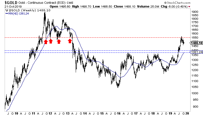 Gold erreichte bei 1.550 Dollar je Unze einen starken Widerstand und seine nachhaltige Korrektur sollte zu einem erneuten Test des vorherigen Breakouts bei 1.400 Dollar je Unze oder sogar 1.375 Dollar je Unze führen, wo es eine extrem starke Ansammlung an Unterstützung gibt.