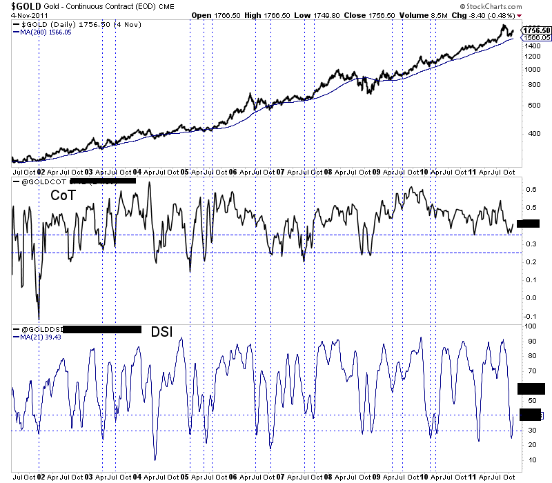 Im unteren Chart plotten wir die Gold-CoT-Daten und den 21-tägigen Gold-DSI (Daily Sentiment Index) von 2001 bis 2011. Wir haben die vergleichbaren korrektiven Tiefs in Gold (mit vertikalen Linien) während seines Bullenruns markiert.