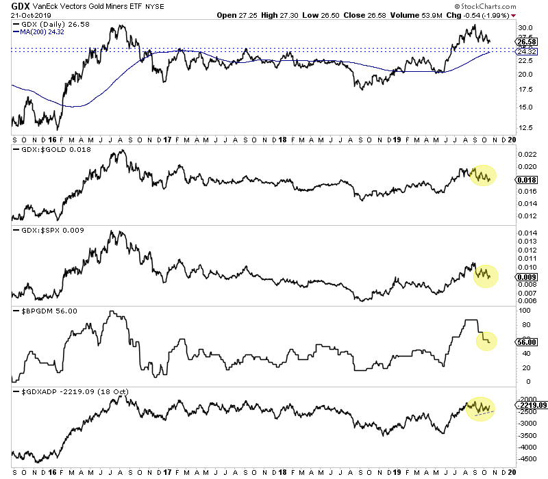 Die Advance-Decline-Linie für den GDX zeigt eine positive Abweichung, doch etwas Derartiges können wir nicht erkennen, wenn es um den GDX gegenüber Gold und Aktienmarkt geht. Der bullische Prozentindex (der oftmals 20% bis 40% während korrektiver Tiefs primärer Aufwärtstrends erreichte) steht bei 56%.