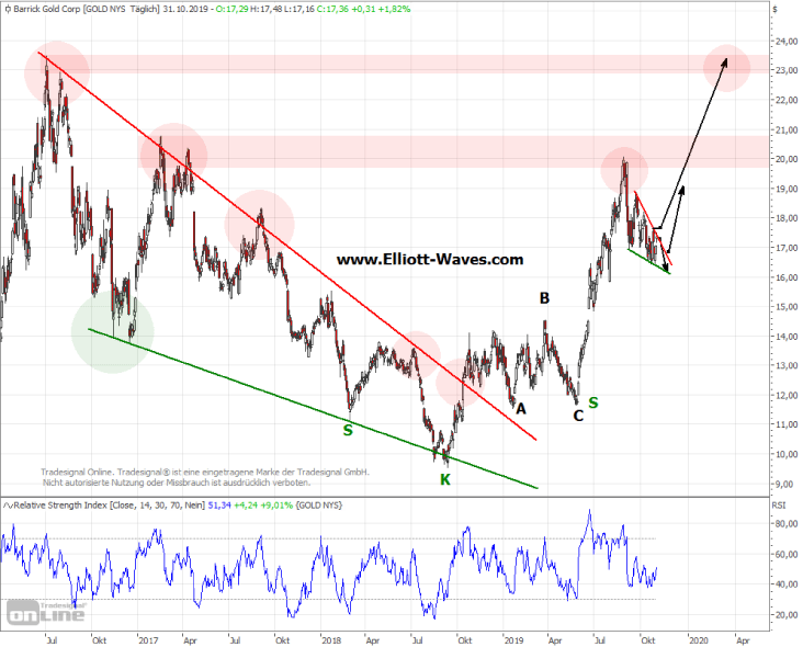 Kurzfristig ist zum jetzigen Stand allerdings nicht gesichert, ob die skizzierte und besagte Flagge mit den Tiefstkursen bei 16,42 USD am 29. Oktober schon final fertig ist. Es könnte sein, dass es innerhalb der Flagge zu einem neuen Korrekturtief auf ca. 16,30 USD kommt. Auf der anderen Seite könnte dieses negiert werden, sobald Barrick per Tagesschlusskurs über ca. 17,70 USD steigt und damit die Flagge nach oben verlässt. In diesem Fall könnte das der Startschuss für die beschriebene Rally sein.