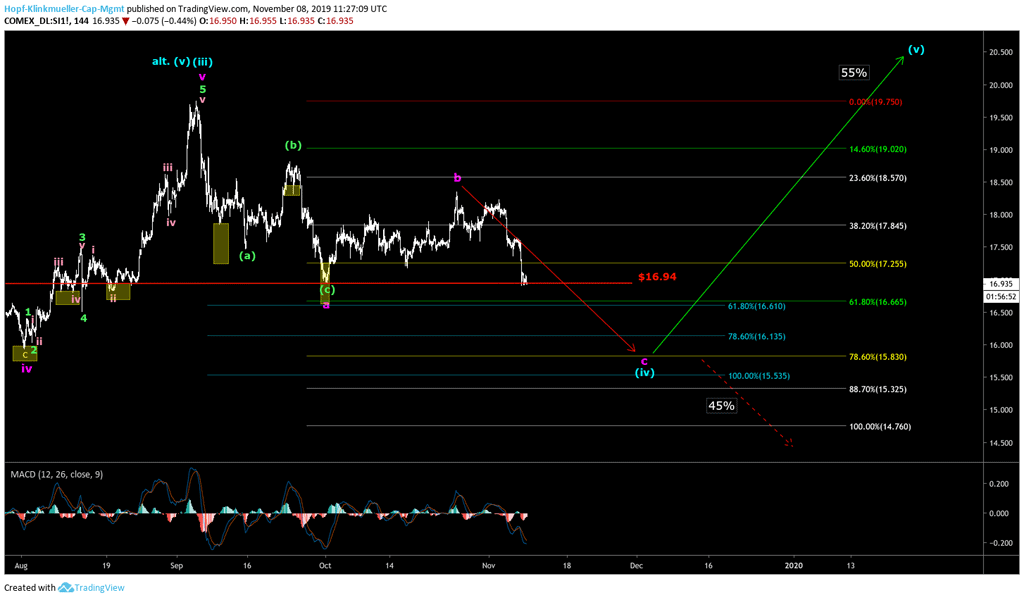 Aus der aktuellen Entwicklung, mit dem neuen Tief unter 16.94 $, müssen wir klar von weiteren Kursverlusten ausgehen, welche zwar noch die Türe offenlassen, dass der Markt doch noch Kurse über 19.75 $ ausbaut. Doch davor werden wir wahrscheinlich Kurse unter 16 $ sehen. Wir werden die nächste Gegenbewegung für einen Short-Einstieg nutzen, um diese Bewegung mitzunehmen und uns dagegen zu versichern, dass es Silber den Boden ausschlägt.