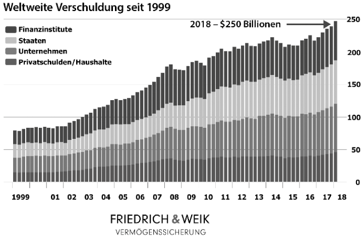 Über 17 Billionen Dollar an Staatsanleihen werden global bereits negativ verzinst. Dies bedeutet, dass Staaten dafür bezahlt werden, Schulden zu machen. Sie werden also dafür belohnt, sich immer weiter zu verschulden. Das betrifft 27 Prozent aller Staatsanleihen weltweit. Die Tendenz ist stark steigend. Insgesamt sind über 50 Prozent der europäischen Anleihen negativ verzinst. Alle deutschen Anleihen bis zu 30 Jahre sind komplett negativ verzinst. Deutschland zahlt mittlerweile kein Geld mehr für seine Schulden, sondern bekommt welches dazu: 2 Euro pro 1.000 Euro, die ihm über zehn Jahre geliehen werden. Dies ist im Übrigen auch ein Grund, warum die Staatsverschuldung sinkt.