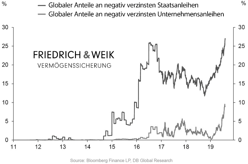 Im Bereich der Unternehmensanleihen ist eine ähnliche Entwicklung zu beobachten. Weltweit sind 10 Prozent negativ verzinst. Tendenz ebenfalls stark steigend. Laut BIS - Bank für Internationalen Zahlungsausgleich - sind bereits 15 Prozent aller Unternehmen in Europa sogenannte Zombieunternehmen, die nur aufgrund des billigen Geldes noch am Leben sind. Bei der nächsten kommenden Rezession werden die Zentralbanken panisch alle Schleusen öffnen, den Zins weiter ins Minus drücken und ohne Ende Geld drucken, um verzweifelt das ganze System zu retten.