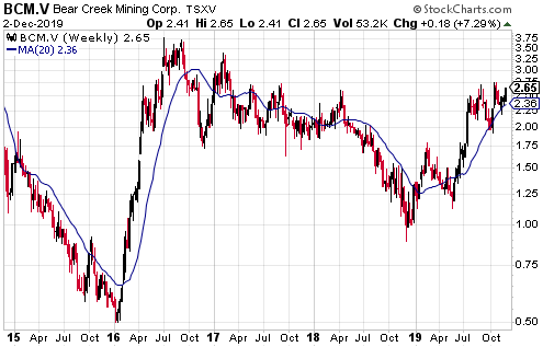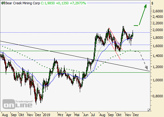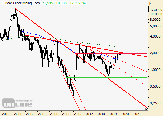 Das kanadische Minenunternehmen Bear Creek Mining Corp. erfuhr zum Monatsauftakt einen starken Zuspruch der Käufer und so schossen die Notierungen zum gestriegen Start um 7,29% nach oben. Mit Blick auf den nachfolgend aufgeführten Langfristchart wird deutlich, dass ein massiver Widerstandsbereich vorausliegt, welche nach Überwindung erhebliches Kurspotenzial in Aussicht stellt. Damit einhergehend wäre die langfristige Abwärtstrendlinie seit 2012 ebenfalls überwunden und somit mehr Details im Nachgang.