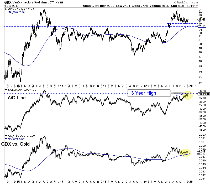 Werfen Sie einen Blick auf den unteren Chart des GDX und der GDX Advance-Decline-Linie.
