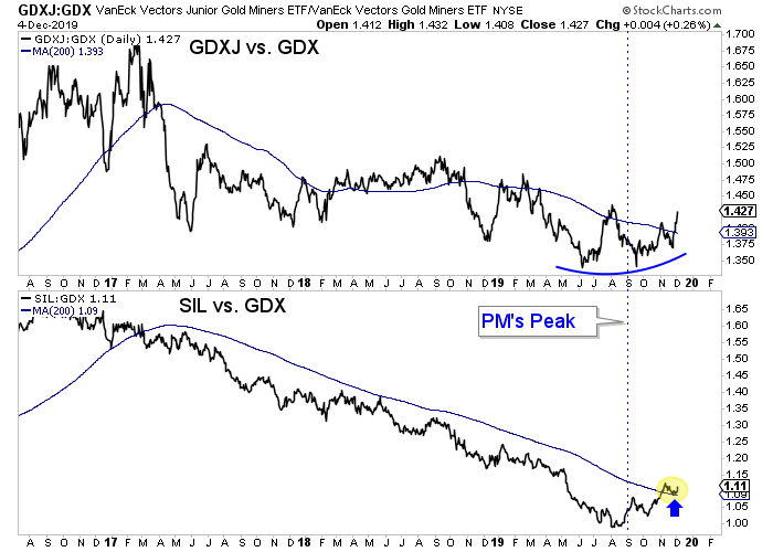 Während es einige positive Aspekte für den GDX gibt, so ist dieser nicht einmal der stärkste Teil des Sektors! Die riskanteren Bereiche der Branche, wie Junior- und Silberaktien, entwickeln sich überdurchschnittlich.