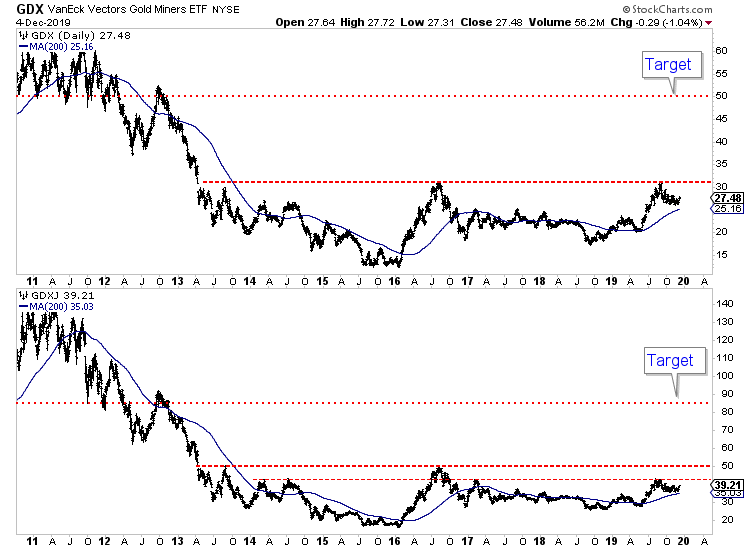 Auf der technischen Seite befinden sich GDX und GDXJ in soliden Aufwärtstrends und werden innerhalb großer langfristiger Basen gehandelt.