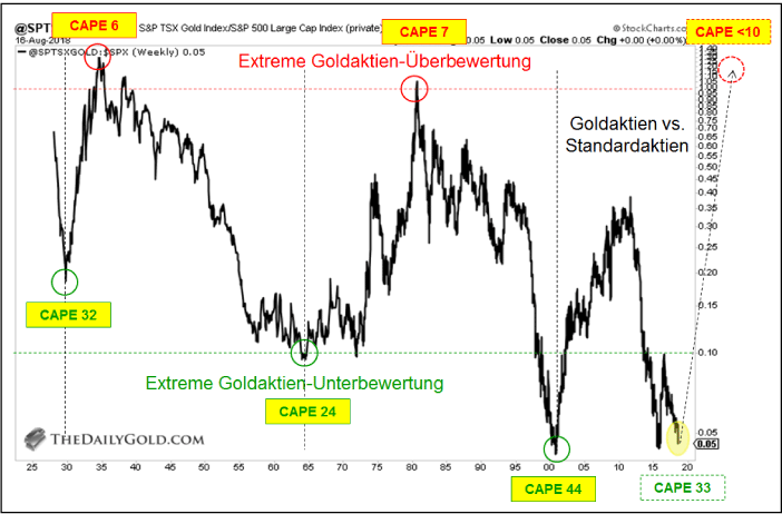 Abb. 5: Goldaktien-Standardaktien-Verhältnis in Bezug zum Shiller-KGV (CAPE) von 1928 bis 2019