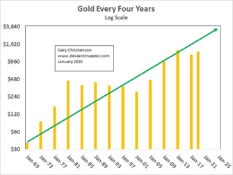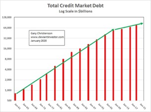 - Schulden: Das ist ein "Selbstläufer." Schulden werden zunehmen. Werfen Sie einen Blick auf die gesamten Kreditmarktschulden der St. Louis Fed der letzten 60 Jahre in 4-Jahres-Durchschnitten - auf, auf und davon in einer exponentiellen Flugbahn. Die Schuldenerschaffung ging nach der Finanzkrise zurück, doch Gesamtschulden von 100 Billionen Dollar sind in Sicht. Mehr Währungseinheiten in Zirkulation bedeuten, dass man mit jeder von ihnen weniger kaufen kann. Wertverlust ist selbstverständlich.