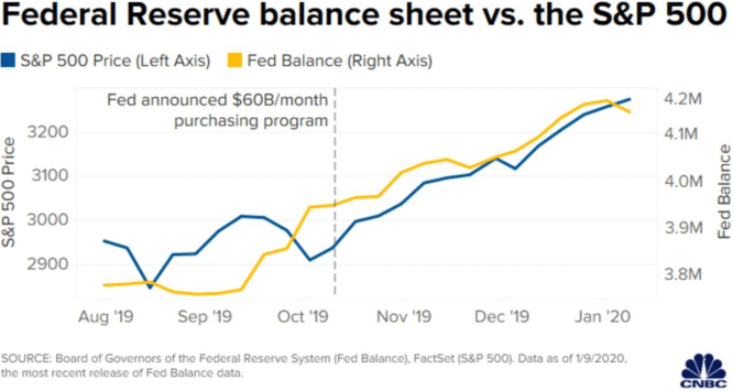 Seit dem vergangenen Herbst hat sich an den Märkten ein klares und verlässliches Muster herausgebildet. Unabhängig von Fundamentals, Bewertungen oder davon, was irgendwo auf der Welt passiert -, die Aktienmärkte kennen nur einen Weg - den nach oben! Schwache Wirtschaftsdaten und selbst geopolitische Konflikte wie zuletzt zwischen den USA und Iran belasten allenfalls für wenige Stunden - ehe die Indizes wie von Geisterhand auf neue Rekordhochs klettern. Für den unnachgiebigen Anstieg gibt es eine wesentliche Ursache: die Fed pumpt Geld in einem Ausmaß in den Markt wie nie zuvor. Seit Oktober ist die Fed-Bilanz um 10 Prozent ausgeweitet worden, gleichzeitig schoss der S&P 500 um 12 Prozent nach oben und markierte sein bestes viertes Quartal seit 2013. An jedem einzelnen Handelstag hat die Fed auf den Repo-Märkten Liquiditätsspritzen bereitgestellt, um die Übernachtzinsen künstlich zu drücken und die steigende Nachfrage der Banken nach Liquidität zu befriedigen. Warum die Märkte nicht fallen?