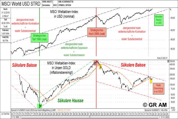 MSCI Weltaktien-Index in USD (oben) vs. MSCI Weltaktien-Index in GOLD (unten) von 12/69 - 01/20