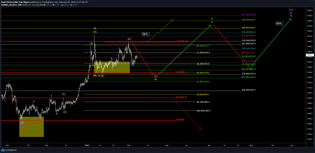 In dieser Woche hat es uns nach über 7 Monaten erwischt. Wir haben nach der längsten Gewinnstrecke unseres Unternehmens im Gold einen Stopp Out Verlust von 1,3% hinnehmen müssen. Wir waren Short im Gold und wurden um knapp einen Dollar am 03.02.2020 ausgestoppt. Danach verkaufte der Markt wie erwartet ab und wir mussten leider leider zusehen wie uns ein sonst ansehnlicher Gewinn flöten ging. Aber das soll keine Beschwerde sein, wenn diese Quote von Gewinnern zu Verlierern anhält wäre das absolut fantastisch. Der Goldpreis hat sich in den letzten zwei Tagen festgefahren. Das übergeordnete Bild, spricht sich weiterhin klar für eine Fortsetzung der Korrektur mit Kursen unter 1539 $ aus, während wir imminent durchaus noch Erholungspotenzial sehen. Wir gehen aber weiterhin nicht davon aus, dass es dem Markt nun gelingt, direkt über 1598 $, respektive 1613 $ auszubrechen. Wir halten uns weiterhin die Option offen, noch mal den Markt zu shorten, sobald das imminente Aufwärtspotenzial neutralisiert wurde. Dies kann bereits heute, oder Montag der Fall sein.