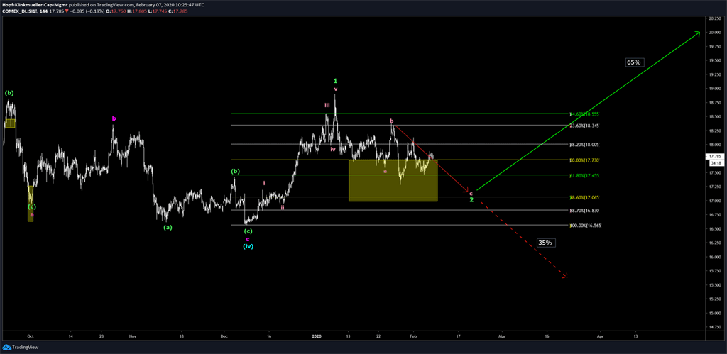 Somit können wir festhalten, da wir einen Ausbruch über 18.34 $ nicht kategorisch für unmöglich halten, halten wir unsere Longs weiterhin. Insbesondere da diese risikolos sind. Wir erwarten aber klar, dass der Markt nochmals deutlich zurückkommt, ehe die Aufwärtsbewegung sich fortsetzt.