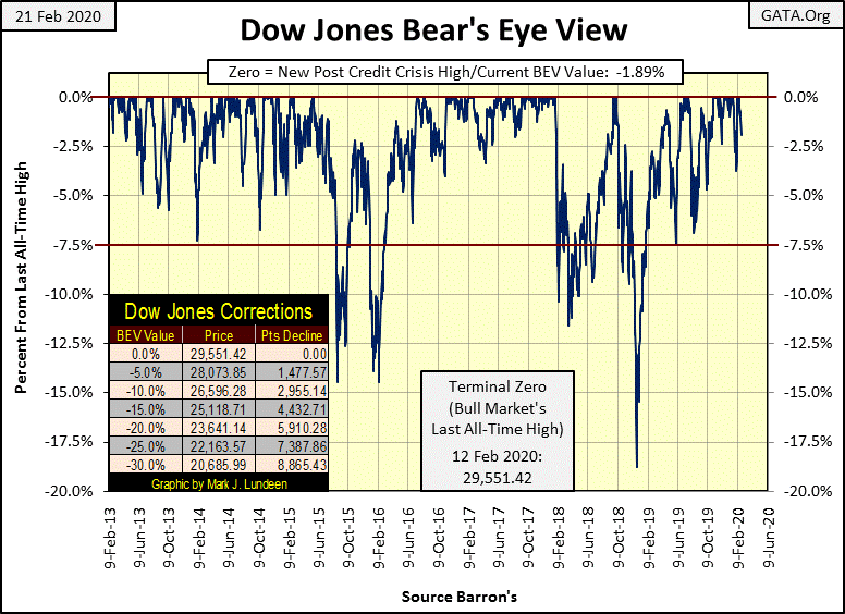 Der Dow Jones Index schloss die Woche fast 2% unter seinem letzten Rekordhoch. Realisieren Sie, dass die Bullen nur glücklich sind, wenn das Objekt ihrer Begierde neue Rekordhochs verzeichnet; etwas, das der Dow Jones in dieser Woche nicht schaffte.Da der Dow Jones also 1,89% unter seinem letzten Rekordhoch schloss, sind die Leute enttäuscht. Doch ich bleibe solange bullisch, wie der Dow Jones über seiner roten -7,5%-Linie in seinem unteren Bear's-Eye-View-Chart bleibt. Tatsächlich gibt es guten Grund, gegenüber dem Aktienmarkt bullisch zu bleiben, solange der Dow Jones keinen zweistelligen BEV-Wert (-10% oder niedriger) verzeichnet.