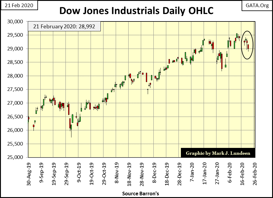 Doch das ist ein Rennen, an dem ich nicht beteiligt bin, da ich nun im Jahr 2020 glaube, dass die möglichen Gewinne in der Edelmetallbranche deutlich diejenigen übersteigen, die am Aktienmarkt möglich sind. Ich folge dem Dow Jones noch immer, weil es für jeden Marktkommentator wichtig ist, dies zu tun.