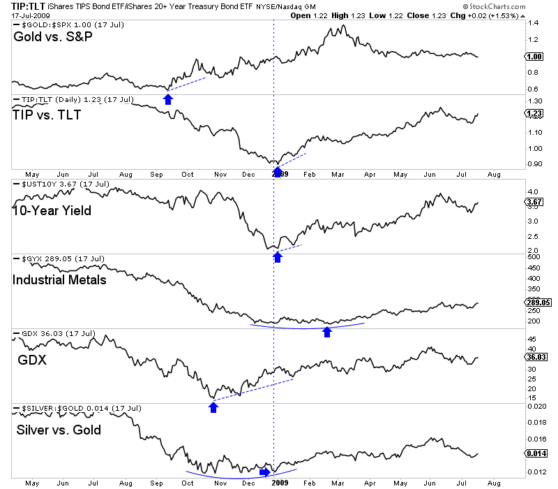 Gehen wir zurück ins Jahr 2008 und überprüfen wie Märkte und Verhältnisse sich während der großen Panik entwickelten. Der Edelmetallkomplex bildete Ende Oktober einen Boden. Gold gegenüber S&P 500 und Gold gegenüber Euro (nicht gezeigt) bildeten im September Böden.