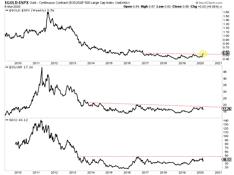 Beachten Sie, wie die Form des Charts über das Verhältnis von Gold und S&P seit 2011 der des Silbercharts ähnelt.