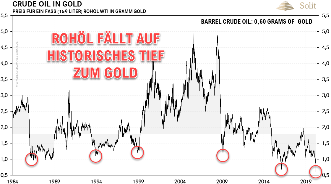 Nominal war der Rohölpreis in den letzten 15 Jahren nur einmal Anfang 2016 so günstig. Berechnet man den Rohölpreis jedoch in Gramm Gold, womit man die Inflation der Fiat-Geldmenge bzw. die Abwertung des US-Dollars berücksichtigt, dann zeigt sich, dass der Rohölpreis mit nur 0,6 Gramm Gold je Fass (159 Liter) aktuell historisch einmalig günstig ist. Nie in der Geschichte war Rohöl so günstig zu haben.