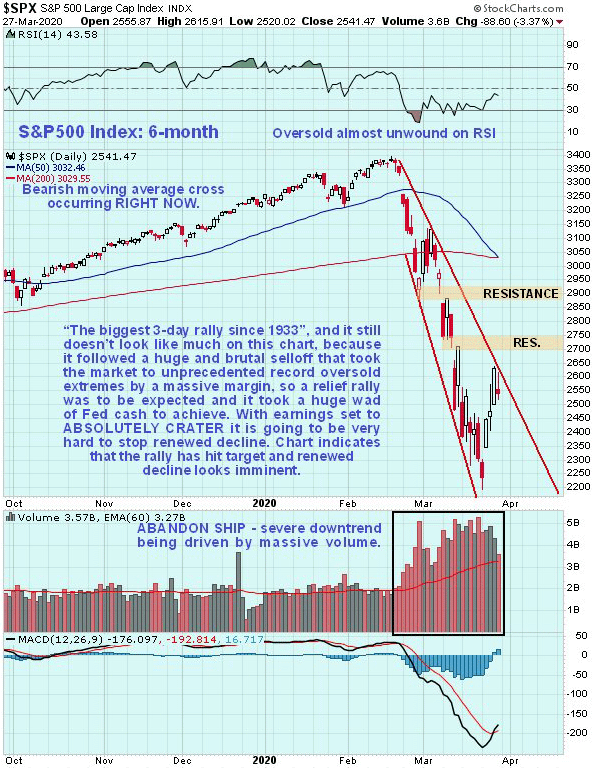 Nach dieser Einführung wenden wir unsere Aufmerksamkeit nun den Charts zu. Wir beginnen mit dem Chart des S&P 500 Index. Wie Sie wahrscheinlich bereits bemerkt haben, sprachen die Mainstream-Medien letzte Woche von der "größten 3-tägigen Rally seit 1933." Diese Rally sahen wir kommen, wie Sie sich erinnern, und ändert gar nichts. Der Markt verzeichnete schlicht eine klassische Erholungsrally von einem deutlich überverkauften Umfeld. Es war für die Fed also einfach, ihn wieder mit einigen Billionen Dollar nach oben zu bringen. Da die Unternehmenserträge einbrechen sollen, wird er bald wieder fallen.