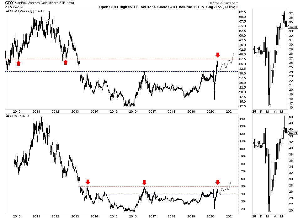 Beginnen wir mit den großen Goldaktien. Der GDX brach gerade aus seiner 7-Jahresbasis aus. Der Begriff "Breakout" wird für fast jede Bewegung am Markt verwendet. Das irritiert mich, da das die Aufmerksamkeit von den echten Breakouts nimmt; wie bei dem, was im GDX passiert ist. Es ist ein Breakout mit Folgen für die nächsten paar Jahre und kürzliche Entwicklungen könnten nur ein erneuter Test des Breakouts sein. Das ist typisch und lehrbuchmäßig.