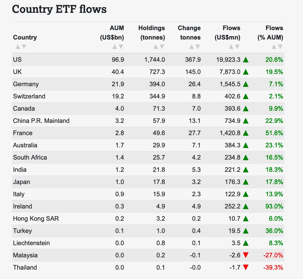 Die starken Zahlen der Zuflüsse der Gold-ETFs in den ersten fünf Monaten des Jahres sind eine Reflektion anhaltenden Interesses an Goldbullion von Fonds und Institutionen, die gegen eine Vielzahl an wirtschaftlichen, finanziellen und geopolitischen Sorgen hedgen. Die Bestände der Vereinigten Staaten sind im Mai um starke 20,6% gestiegen. Beachten Sie zudem das wachsende Interesse in verschiedenen europäischen Ländern und China. Mit 3.510 Tonnen Gesamtreserven übersteigen die Bestände der ETFs weltweit nun die offiziellen Goldreserven jedes Landes, mit Ausnahme der USA.