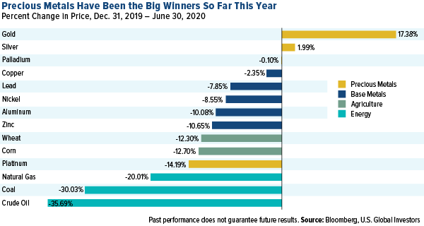 Jedes Jahr zu dieser Zeit überprüfen wir die Rohstoffe für unseren beliebten Rohstoffhalbzeitbericht. Dieses Jahr war es noch nicht einmal ein echter Wettbewerb. Die Edelmetalle stellten sich in den ersten sechs Monaten 2020 als die größten Gewinner heraus. Spot-Gold war auf Platz 1 und stieg um mehr als 17%, gefolgt von Silber auf Platz 2, das um fast 2% stieg. Palladium war auf Platz 3, praktisch unverändert mit negativen 0,10%.