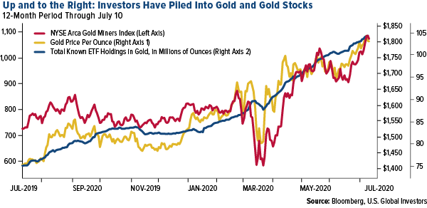 Viele prognostizieren nun Rekordhochs für Gold innerhalb der nächsten 12 Monate, wobei Goldman Sachs 2.000 Dollar je Unze aufgrund "ungleicher Erholung" erwartet. "Seien Sie Long Kupfer, Silber und Stahl und bleiben Sie Long gegenüber Gold", so Analysten von Goldman in einer Notiz an Investoren. Goldaktien und goldgedeckte ETFs verzeichneten während dieser Rally weiterhin unglaubliche Zuflüsse. Senior-Goldbergbauunternehmen, gemessen durch den NYSE Arca Gold Miners Index, stiegen in den 12 Monaten um phänomenale 145%.