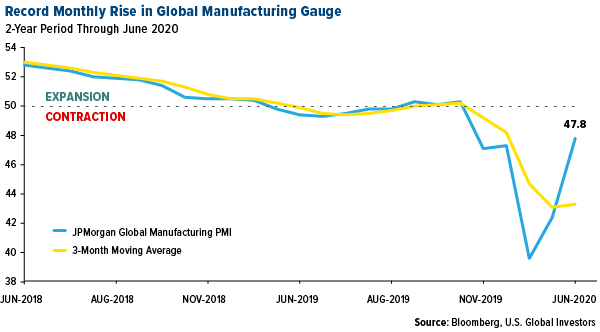 Produktion weltweit bewegt sich in die richtige Richtung, konstruktiv für BasismetalleDie Basismetalle schlossen die sechs Monate niedriger, da COVID-19 den Produktionssektor praktisch stilllegte und Fabriken auf der ganze Welt zum Stillstand brachte. Ich sage dies mit Vorsicht, doch es könnte gute Neuigkeiten geben. Der JPMorgan Global Manufacturing PMI, der die Produktionsaktivität auf der Welt verfolgt, verzeichnete im Juni 47,8. Auch wenn dies keine Expansion andeutet, so bedeutet dies, dass die Fabriken in geringerem Maße kontrahieren als noch vor zwei Monaten. Des Weiteren ist die Zunahme im Juni die stärkste, die für einen einzelnen Monat je verzeichnet wurde; ein Anstieg um 5,4 Punkte von 42,4 im Mai, was andeutet, dass eine Erholung stattfinden könnte.