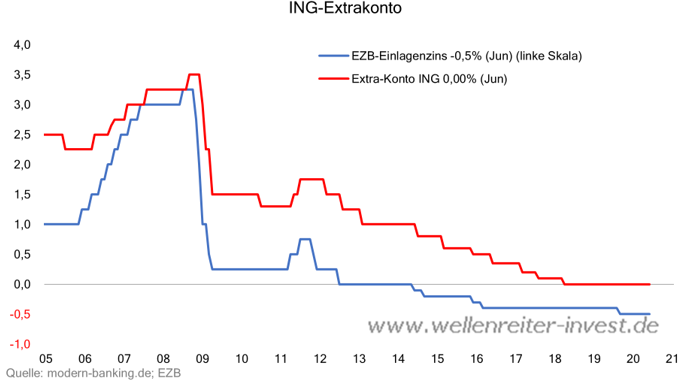 Mit der Finanzkrise rutschte der Extrakonto-Zinssatz auf 1,5 Prozent (2009). Einer kurzen Erholung im Jahr 2011 folgte eine Abwärtsspirale. Die ING stellte die Zahlung von Zinsen im April 2018 ein, anderen Banken reagierten ähnlich. Es begann das Anfang vom Ende dieser Anlageform, sollte man meinen.