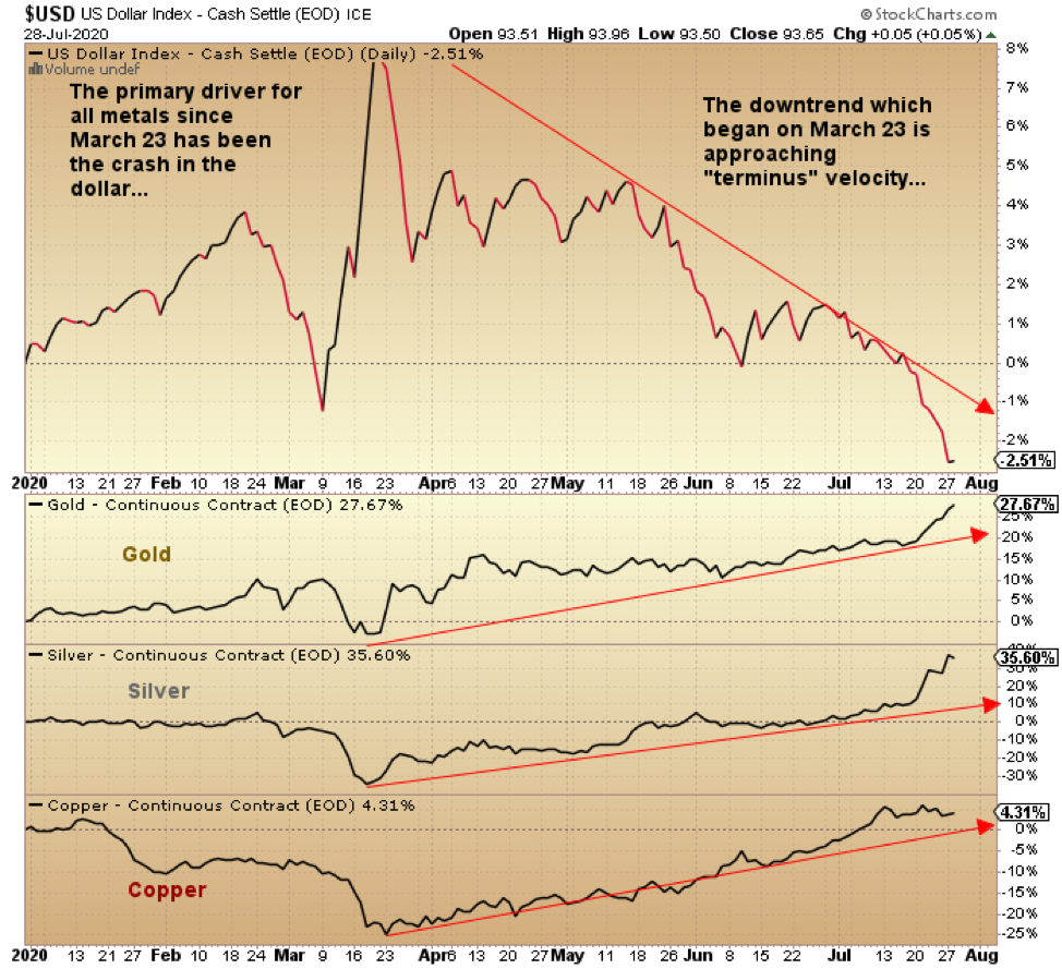 Wenn ich schreibe, dass sich die täglichen Stimmungswerte für Silber nun 95 annähern und der RSI des SLV bei 85 liegt, dann ist das exakt etwas, "das jeder sicher weiß." Stimmungsindikatoren wie der DSI und der RSI bereiten uns auf Enttäuschung vor und der Grund dafür ist einfach: Der primäre Treiber der Entwicklung vom März bis August war die Anti-Dollar-Initiative der US-Politiker und deren Zentralbank. Wenn sie einen Rückzug beginnen, wird der Dollar eine Rally verzeichnen und die primären Edelmetalltreiber werden darunter leiden.
