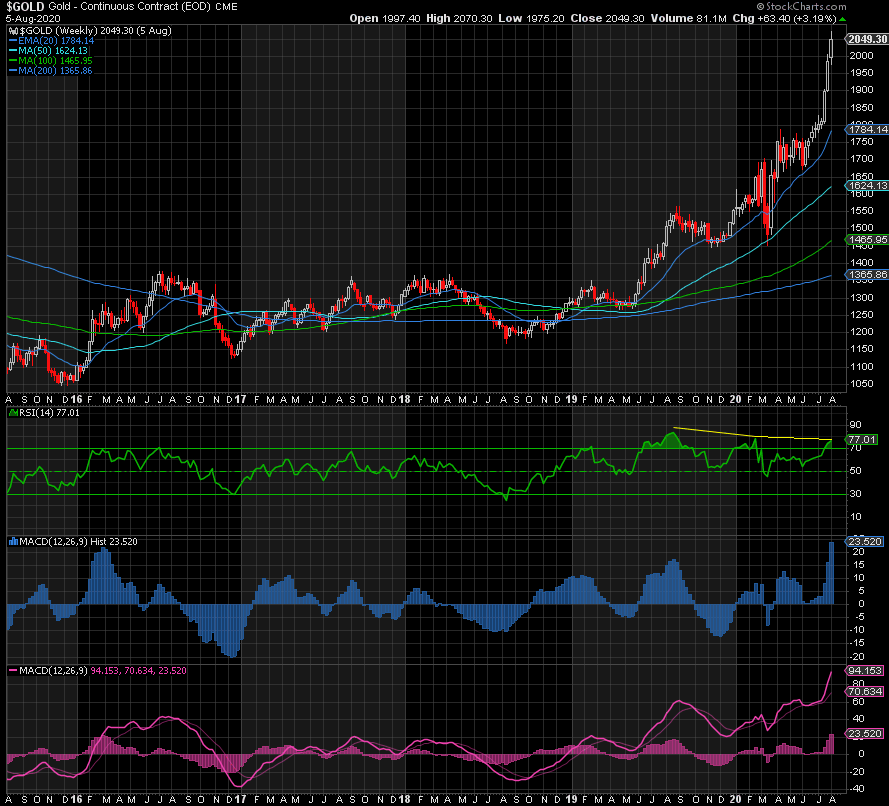 Der wöchentliche RSI stimmte mit der Spitze von 2011 bei 84 im August 2019 überein und hat bereits zwei negativ abweichende höhere Hochs verzeichnet. Entweder durchbricht er die 84, um einen neuen Rekord zu verzeichnen, oder wir verzeichnen eine weitere negative Abweichung, bevor es abwärts geht. Das MACD-Histogramm und die MACD-Linie befinden sich bei 24 und 94 und haben somit Raum nach oben, bevor sie die Niveaus von 2011 erreichen, was ebenfalls höhere Hochs andeuten könnte. Offensichtlich sind beide extrem überkauft, doch könnten diesen Zustand noch intensivieren.