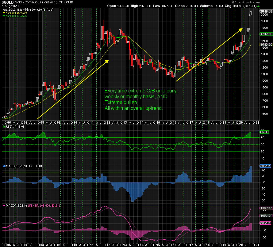 Das Beste kommt zum Schluss: Im Monatschart befindet sich der RSI nun auf denselben Rekordhochs - wie wir sie 2008 und 2006 sahen - die zu Rückgängen um 35% und 25% führten. Das bedeutet jedoch nicht das Ende des Bullenmarktes, sollte es zu einem deutlichen Rückgang kommen. Wie wir im Chart sehen können, begann der Preis seine mehrjährige Abnahme um 50% erst nach Verzeichnen eines negativ abweichenden höheren Hochs im Jahr 2011.