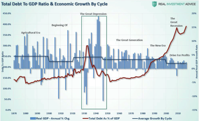 Abbildung 2: U.S.-Gesamtverschuldung prozentual zum Bruttosozialprodukt, inkl. realem BSP-Wachstum auf Quartalsbasis, von 1870 bis 2018 (REAL INVESTMENT ADVICE - https://realinvestmentadvice.com/the-economic-consequences-of-debt/)