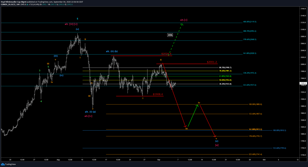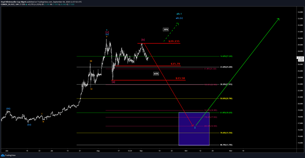 Obwohl Gold, der SPDR Gold Trust (GLD) als auch Silber wie von uns antizipiert in eine Korrekturbewegung übergegangen sind, werden wir nicht alle drei Märkte gleich behandeln. Es ist nun Vorsicht geboten für die Bären. Hier bahnt sich aktuell ganz klar eine Gegenbewegung an und bestätigt unsere primäre Erwartung, dass wir wohl nicht direkt unter die 1908 $ durchziehen können. Wir müssen nun einen erneuten Rücklauf in den Bereich von 1954 $ bis zum Extremfall nochmal von 1990 $ einplanen. Keinesfalls darf Gold hier mehr über 2001.2 $ ausbrechen, sonst müssen wir uns vom aktuell hinterlegten Verlauf wahrscheinlich verabschieden.