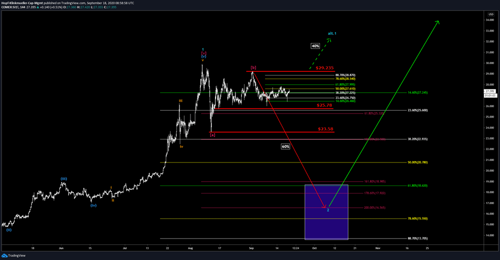Sollten die Bullen den Kurs über die 29.235 $ befördern, ist der Ofen für die Bären erst einmal aus. Die Folge wären dann weitere Anstiege und ein folgendes Hoch im 32 $ Bereich. Auch hier verfahren wir von der Taktik nach dem gleichen Muster. Wir stehen aktuell am Seitenrand und warten ab. Wir legen uns hier auf gar nichts fest und werden adaptiv reagieren, wenn der Markt uns eine klare Entscheidung bietet. Brechen wir aus im Gold und oder Silber werden wir zeitnah weitere Long Positionen eingehen.