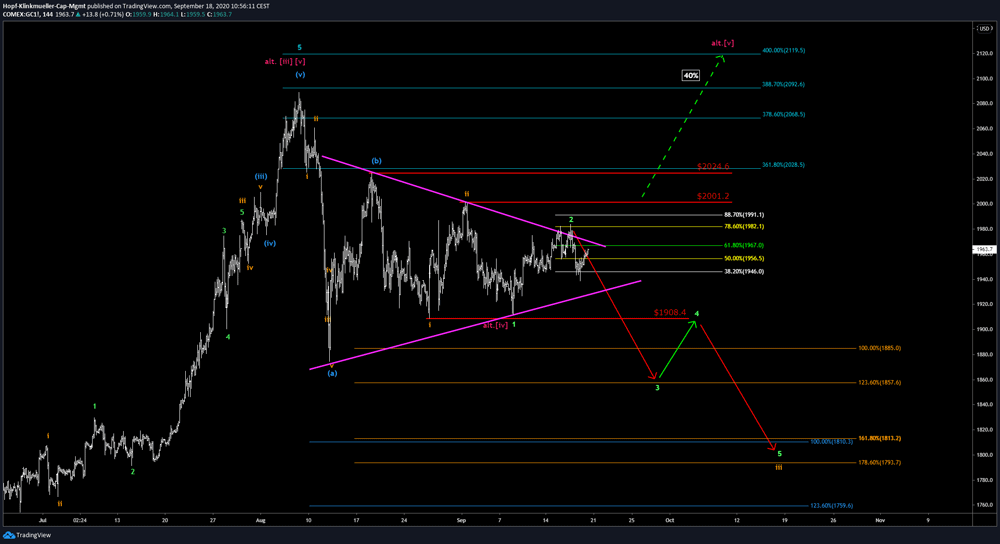 Das Kursszenario welches wir beobachten, ist nach wie vor intakt. Es ist ein im Chart zusammenlaufendes Dreieck. In über 70% der Fälle wird so ein Dreieck impulsiv in eine Seite verlassen. Es ist aktuell nicht zwingend zu wissen ob es auf oder abwärts geht. Wir sitzen hier wie der Jäger auf dem Hochsitz und warten ab, bis uns etwas vor die Flinte läuft.Die Bären im Gold liefern im Mittwochshandel keine schlechte Arbeit ab. Nach dem Erreichen des 78.6% Retracements geht es nach Süden. Dies ist ein erster positiver Schritt, wir müssen unsere Euphorie aber noch bremsen, da das Dreieck und die damit verbundene Alternative noch immer intakt ist. Für ein klares Zeichen, dass wir uns in Welle 3 in Grün befinden, müssen wir die untere Lila Trendlinie unterschreiten. Final muss der Kurs unter das Tief der Welle 1 in Grün bzw. die 1908 $.