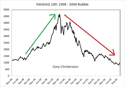 Der Silberpreis fiel Anfang 1991 auf 3,51 Dollar und im November 2001 auf 4,01 Dollar. Es brauchte zwei Jahrzehnte, bevor die Silberblase korrigierte. Der auf Technologie fokussierte NASDAQ 100 Index wurde Anfang 1998 für unter 1.000 verkauft. Er erreichte im März 2000 eine Spitze bei 4.800 und fiel im Oktober 2002 auf 795. Der NASDAQ stieg auf nicht-nachhaltige Niveaus, basierend auf einer guten Story und Kredit, und fiel innerhalb von zwei Jahren auf Vor-Blasen-Niveaus zurück.
