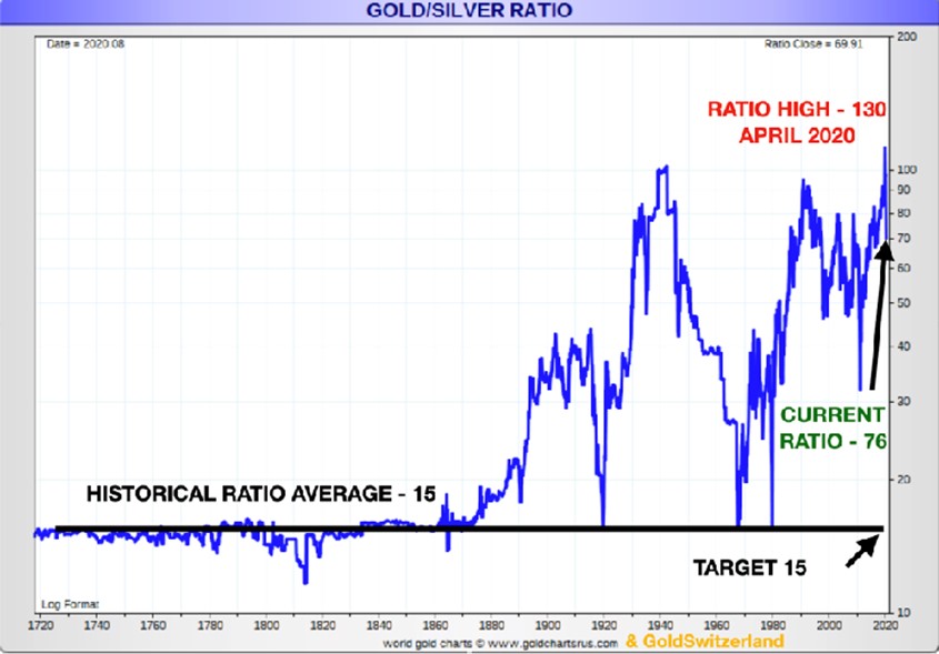 Im April hatte das Gold-Silber-Verhältnis fast einen Stand von 130 erreicht (siehe Chart unten) - ein Extrem! Jetzt ist es wieder auf 77 gefallen. Wahrscheinlich wird es anfänglich auch wieder auf 30 fallen, wo es 2011 stand. Letztendlich werden wir wahrscheinlich wieder den historischen Durchschnitt von 15 erreichen, oder sogar 10, wo das Verhältnis von Gold zu Silber im natürlichen Vorkommen liegt.