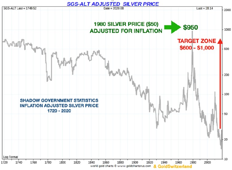 Bei realer Inflationsbereinigung auf Grundlage von ShadowStatistics entspräche das 50 $-Silber-Hoch von 1980 heutigen 950 $. Ein Silberpreis zwischen 600 $ und 1000 $ ist also kein unrealistisches Ziel.